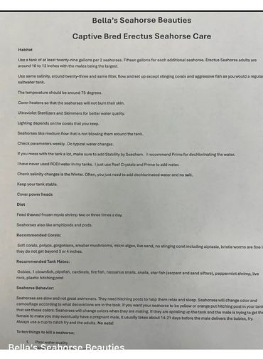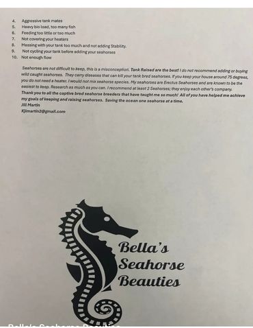 At Bella's Seahorse Beauties, we are dedicated to the care and breeding of Erectus Seahorses. Our passion is to promote awareness and appreciation for these unique marine creatures. The best way to view current seahorses is to visit My social media Pages on Facebook, Instagram and TikTok. Do you have a question or concern? E-mail me or send a message through my social media Pages at Bella's Seahorse Beauties.